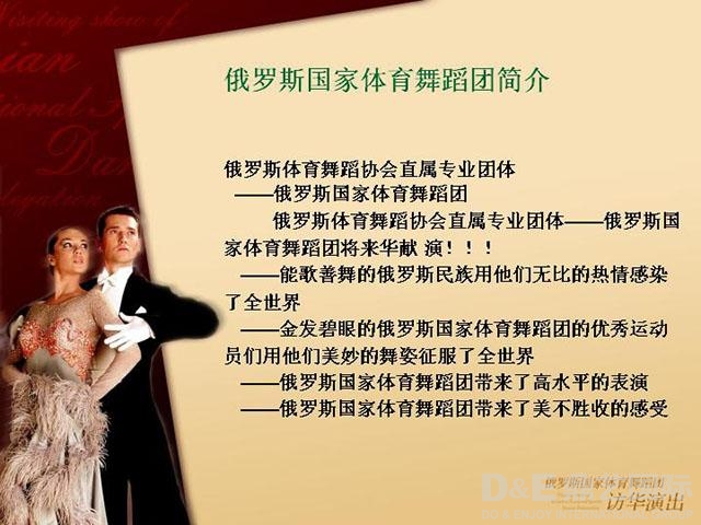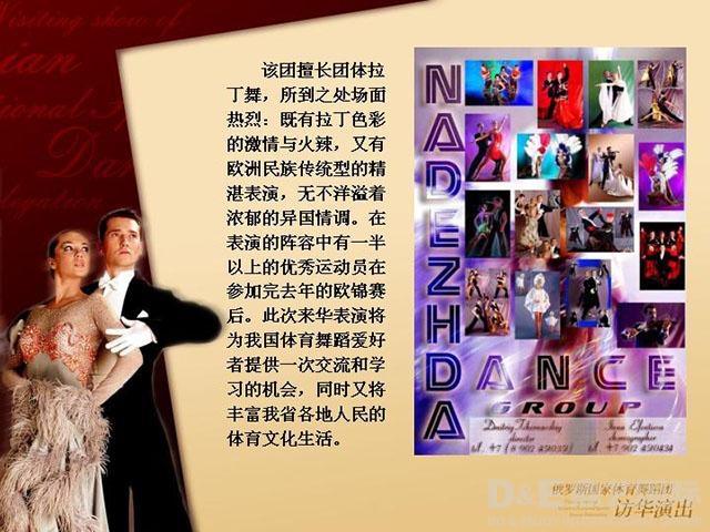 能歌善舞的俄罗斯民族用他们无比的热情感染了全世界,金发碧眼的俄罗斯国家体育舞蹈团的优秀运动员们用他们美妙的舞姿征服了全世界,俄罗斯国家体育舞蹈团带来了高水平的表演,俄罗斯国家体育舞蹈团带来了美不胜收的感受。