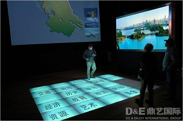 展厅特定区域地面或墙面有针对性的点式安装感应式地板,相邻墙壁吊以多台液晶显示器。当观众进入地图区域,踩到相应重点介绍点的地板时,针对该区域的相关视频介绍就会在墙壁镶嵌的液晶显示器中播放,当多个点的感应式地板被触发时,计算机将通过不同的显示器针对不同的区域进行对应的视频播放,播放的视频可以根据馆方需要随时进行更改。