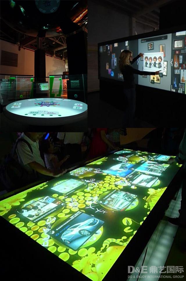 多点触摸桌(屏),使用两点或两点以上不同介质触摸屏幕表面,可多人参与,画面中的图标影像与感应点一 一对应,可以完美实现图片缩放、旋转等各种多点触摸应用。在技术上我们通过红外技术、投影技术、影像拼接技术、感应识别技术来实现,终端系统会根据观众点击位置进行采集、传输、处理并通过计算机系统中的特殊软件处理使观众看到独特的视觉效果。